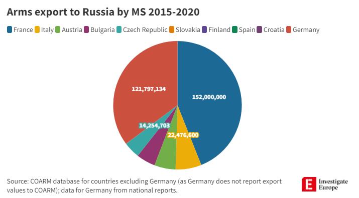 Τα στοιχεία του Συμβουλίου Εργασίας για τις Εξαγωγές Συμβατικών Όπλων της ΕΕ δείχνουν ότι δέκα κράτη-μέλη εξήγαγαν στην Ρωσία στρατιωτικό εξοπλισμό συνολικής αξίας 291 εκατομμυρίων λιρών στο διάστημα 2015-2020. Το μερίδιο του λέοντος και συγκεκριμένα ποσοστό 44% των εξαγωγών αυτών το εξασφάλισε η Γαλλία.