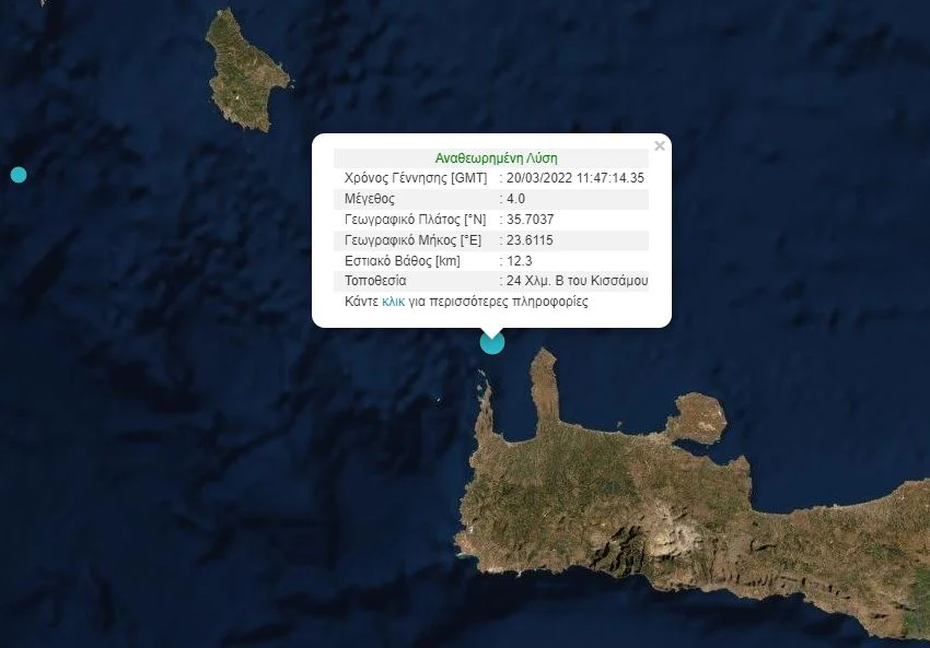 Σύμφωνα με την αυτόματη μέτρηση του Γεωδυναμικού Ινστιτούτου, το επίκεντρο εντοπίζεται 24 χιλιόμετρα βόρεια της Κισάμου στα Χανιά.
