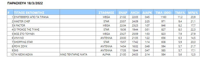 Τα κατάφερε επίσης και το «X Factor» που ως «νέο πρόγραμμα» διατήρησε το ενδιαφέρον της αρχής. Στο Top 10 και το παιχνίδι με φάρσες «Τι φάση;» του Alpha με τον Γιώργο Τσαλίκη και την Εβελίνα Νικόλιζα.