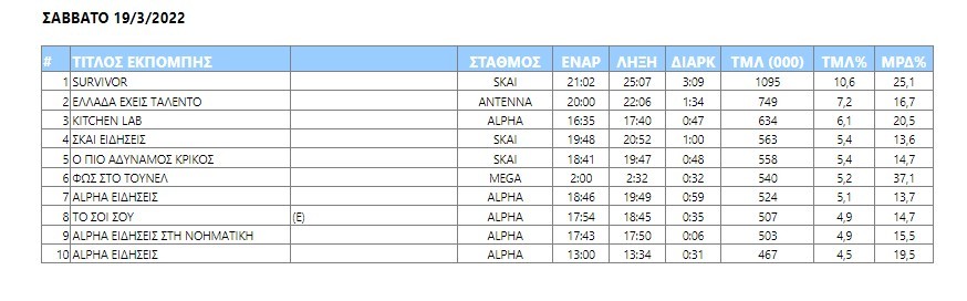 Το Σάββατο με τα βαριά χαρτιά της ελληνικής μυθοπολασίας να έχουν ρεπό, ξεχώρισε ως δημοφιλέστερη επιλογή το ριάλιτι «Survivor» και δεύτερο επικρατέστερο πρόγραμμα το σόου «Ελλάδα έχεις ταλέντο».