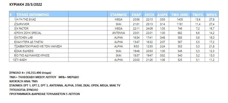 Η Κυριακή ήταν μια Κυριακή όπως και οι άλλες (Κυριακές) με τη σειρά «Η γη της ελιάς» να είναι μακράν η δημοφιλέστερη. Κόσμο στον Σκάι μάζεψε και το «Survivor».