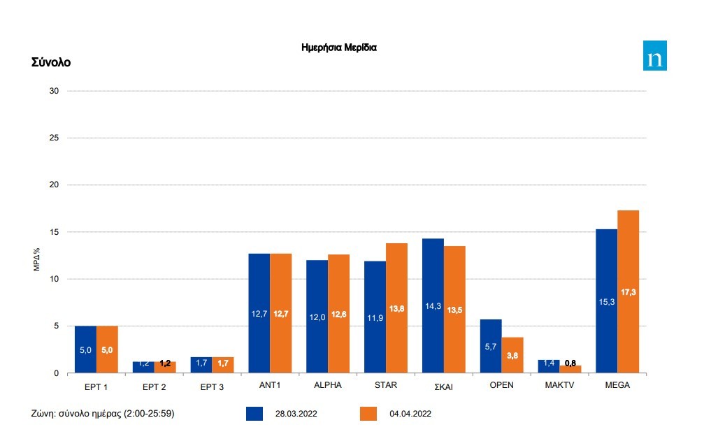 Την ημέρα πάντως «πήρε» το Mega, το Star είχε το δεύτερο σε μέγεθος μερίδιο, οριακά μικρότερο από αυτό του Star, ήταν του Σκάι, στο «νήμα» πέρασε μπροστά o ΑΝΤ1 από τον Alpha, σταθερή η ΕΡΤ1, ενώ το Open χθες περιορίστηκε στο μόλις 3,8%.