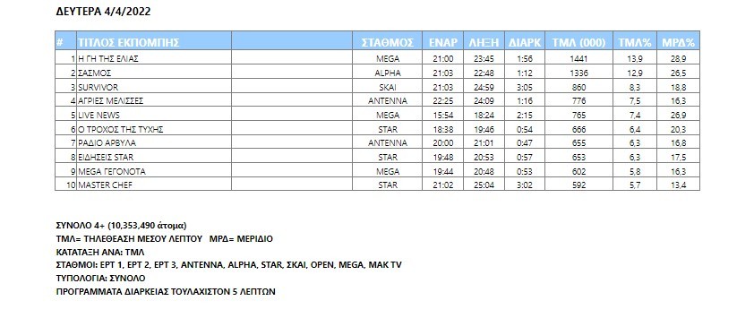 Η υπόθεση Πισπιρίγκου «βοήθησε» ώστε να παραμείνουν στην δεκάδα και τη Δευτέρα, 4 Απριλίου, η εκπομπή «Live News», το κεντρικό δελτίο του Mega, και το αντίστοιχο του Star.