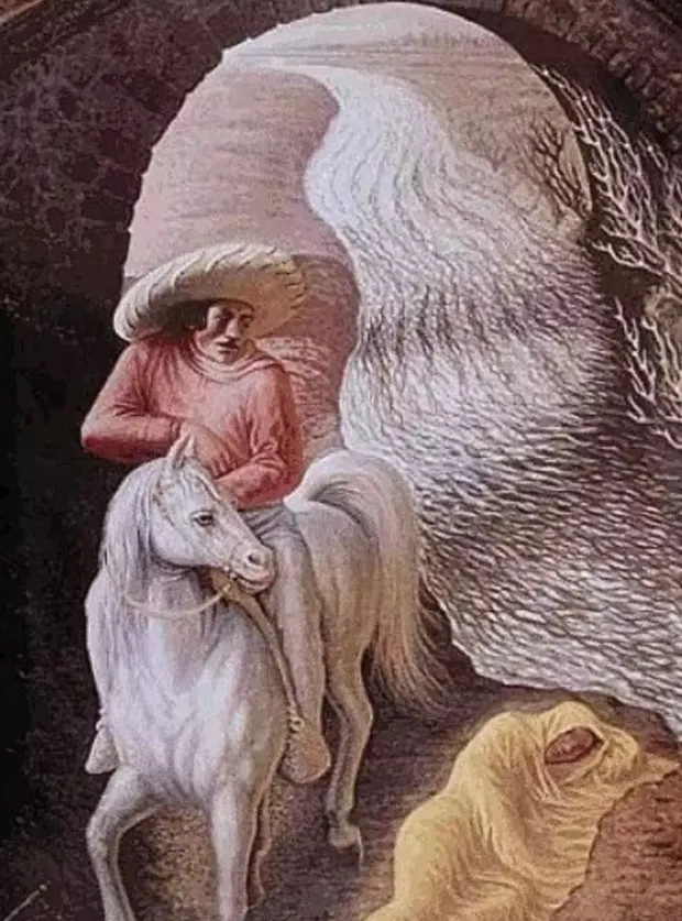 Κάποιοι βλέπουν πρώτα το πρόσωπο ενός γέρου άνδρα. Άλλοι έναν νεαρό έφιππο άνδρα. Πολλοί παρατηρούν το νεαρό κορίτσι που είναι ξαπλωμένο στην όχθη του ποταμού και άλλοι εστιάζουν αρχικώς στην γέφυρα πάνω από το ποτάμι.