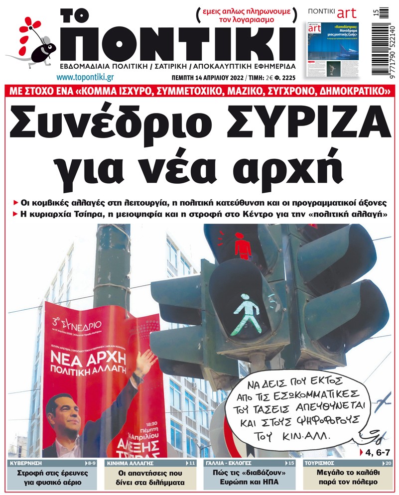 Με πρωτοσέλιδο τίτλο «Συνέδριο ΣΥΡΙΖΑ για νέα αρχή» και αναλυτικό – αποκαλυπτικό ρεπορτάζ για τις κομβικές αλλαγές στη λειτουργία, την πολιτική κατεύθυνση και τους προγραμματικούς άξονες, αλλά και την κυριαρχία Τσίπρα, τη μειοψηφία και τη στροφή στο Κέντρο για την «πολιτική αλλαγή» κυκλοφορεί το «ΠΟΝΤΙΚΙ» το πρωί της Πέμπτης.
