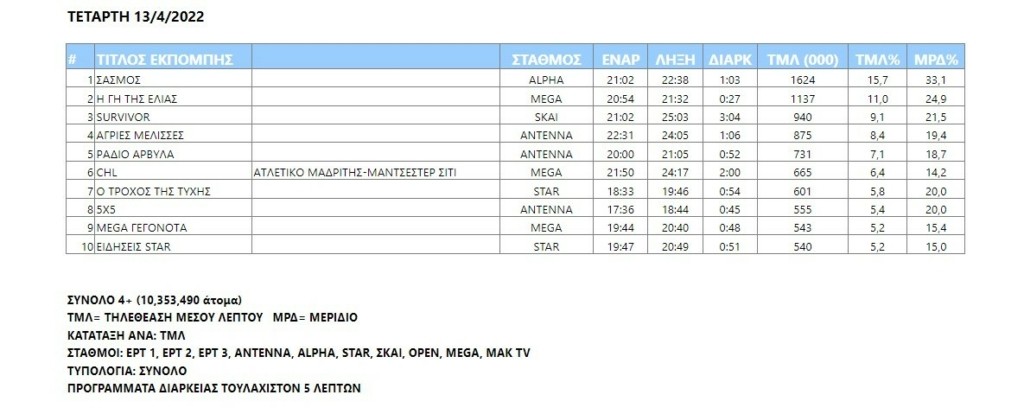 Η σατιρική εκπομπή «Ράδιο αρβύλα» επανήλθε στη μέση του Top-10, ενώ στην έκτη θέση προτιμήσεων βρέθηκε η απευθείας μετάδοση της ποδοσφαιρικής αναμέτρησης Ατλέτικο Μαδρίτης- Μάντσεστερ Σίτι για το «εισιτήριο» στα ημιτελικά του Champion’s League.