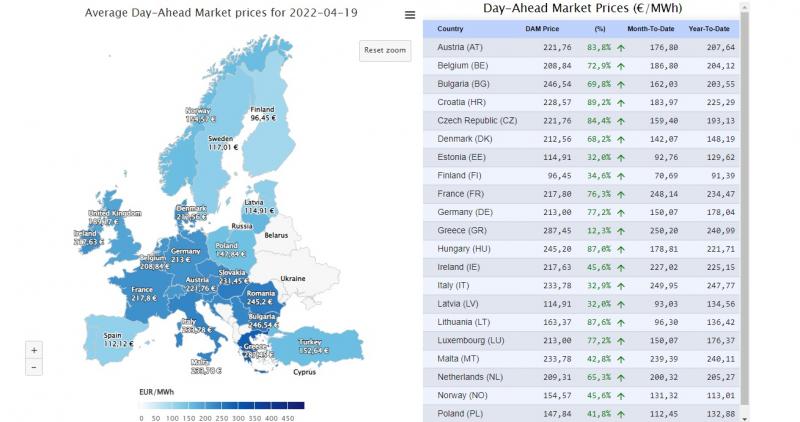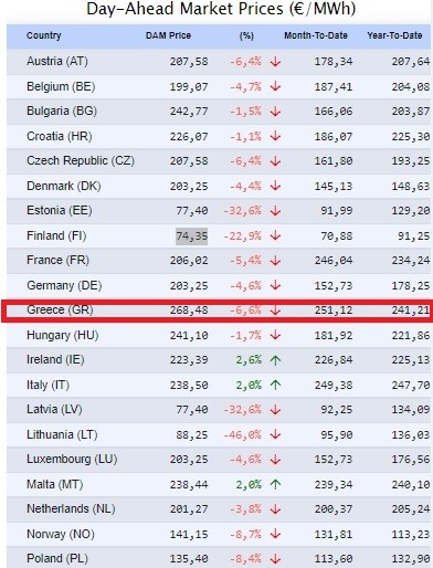 Όπως αποτυπώνεται στον Ευρωπαϊκό Χάρτη Τιμών Ηλεκτρισμού της Αγοράς Επόμενης Ημέρας, η χονδρεμπορική τιμή της μεγαβατώρας στην Ελλάδα φτάνει τα 268,48 ευρώ, με τη Βουλγαρία να ακολουθεί και την τιμή στη γειτονική χώρα να διαμορφώνεται στα 242,77 ευρώ. Στην τρίτη θέση η Ουγγαρία με 241,10.