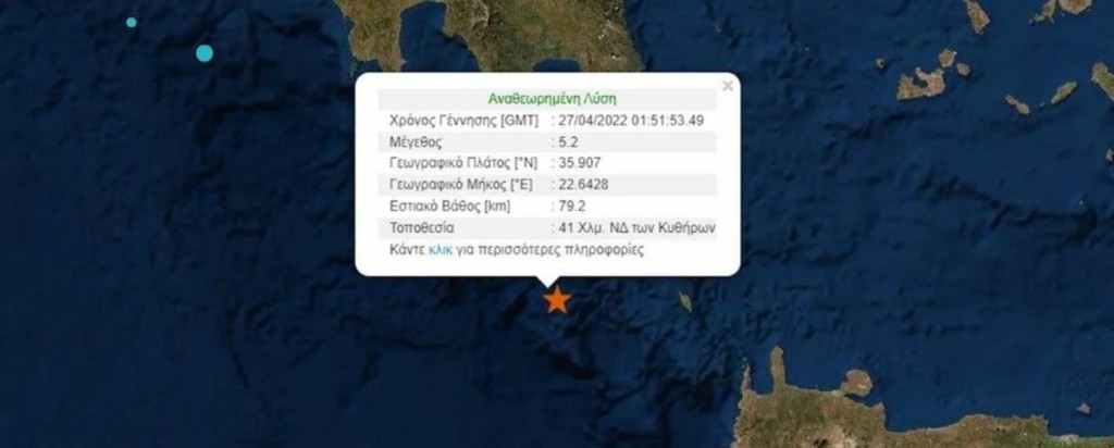 Συγκεκριμένα, σύμφωνα με το Γεωδυναμικό Ινστιτούτο, λίγο πριν από τις 05:00 (στις 04:51), καταγράφηκε σεισμός της τάξεως των 5,2 βαθμών της κλίμακας Ρίχτερ -που χαρακτηρίζεται «ισχυρός»– στην υποθαλάσσια περιοχή 41 χιλιόμετρα νοτιοδυτικά των Κυθήρων, με εστιακό βάθος 79 χλμ.