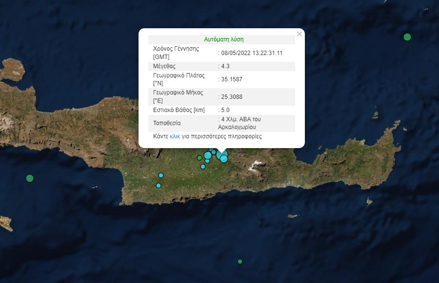 Ισχυρή σεισμική δόνηση μεγέθους 4,3 βαθμών της κλίμακας Ρίχτερ σημειώθηκε πριν από λίγο στην Κρήτη, 23 χιλιόμετρα νοτιοανατολικά της πόλης του Ηρακλείου.
