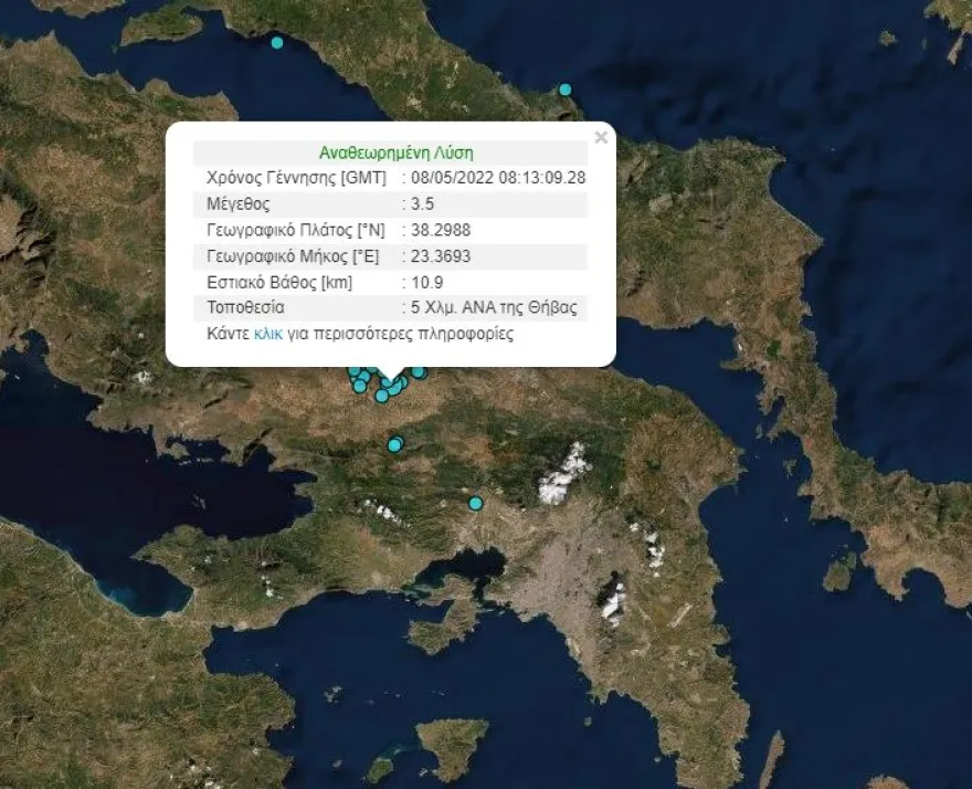 Σεισμική δόνηση εντάσεως 3,5 βαθμών της κλίμακας Ρίχτερ σημειώθηκε, στις 11.13 το πρωί, σε απόσταση 8 χιλιομέτρων ανατολικά της Θήβας.