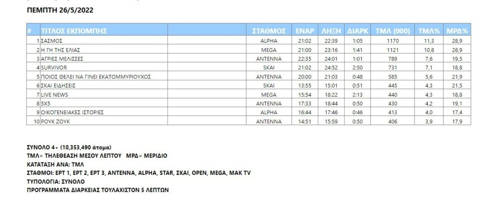 Δηλαδή στην πρώτη πεντάδα της Πέμπτης οι τηλεθεάσεις των εκπομπών ήταν 11,3% («Σασμός»), 10,8% («Η γη της ελιάς»), 7,6% (Άγριες μέλισσες»), 7,1% («Survivor»), 5,6% («Ποιος θέλει να γίνει εκατομμυριούχος»). Στο Top 5 της Τετάρτης οι αντίστοιχες τηλεθεάσεις ήταν: 11,4% («Σασμός»), 11% («Η γη της ελιάς»), 8% («Survivor»), 7% (Άγριες μέλισσες»), 6,2% («Ποιος θέλει να γίνει εκατομμυριούχος»).