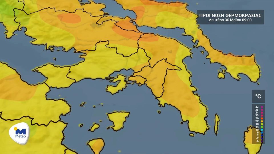 Η θερμοκρασία θα κυμανθεί στη Δυτική Μακεδονία από 10 έως 28-29 βαθμούς, στην υπόλοιπη Βόρεια Ελλάδα από 10 έως 31-32, στην Ήπειρο από 9 έως 27 βαθμούς στη Θεσσαλία από 10 έως 32-33, στα υπόλοιπα ηπειρωτικά από 11 έως 31-32 βαθμούς, στα νησιά του Ιονίου από 14 έως 25-26 και στα νησιωτικά τμήματα του Αιγαίου και στην Κρήτη από 11 έως 27-28 βαθμούς και στα νησιά του Νοτιοανατολικού Αιγαίου έως 29 βαθμούς Κελσίου.