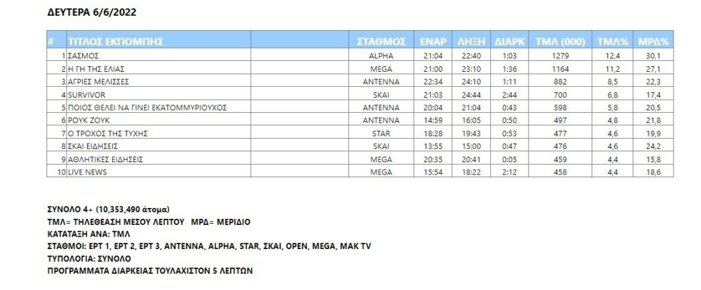 Τέταρτο σε προτιμήσεις πρόγραμμα το ριάλιτι «survivor», όμως με 6,8% και είναι αρχή της εβδομάδας.
