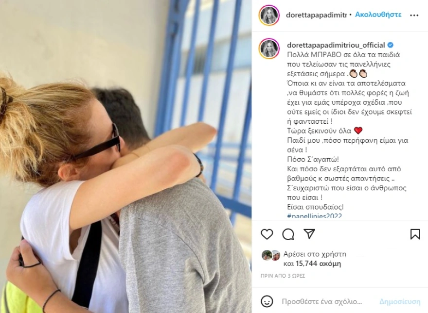 «Πολλά μπράβο σε όλα τα παιδιά που τελείωσαν τις πανελλήνιες εξετάσεις σήμερα. Όποια κι αν είναι τα αποτελέσματα, να θυμάστε ότι πολλές φορές η ζωή έχει για εμάς υπέροχα σχέδια, που ούτε εμείς οι ίδιοι δεν έχουμε σκεφτεί ή φανταστεί ! Τώρα ξεκινούν όλα. Παιδί μου, πόσο περήφανη είμαι για σένα! Πόσο Σ´αγαπώ! Και πόσο δεν εξαρτάται αυτό από βαθμούς κ σωστές απαντήσεις .. Σ´ευχαριστώ που είσαι ο άνθρωπος που είσαι ! Είσαι σπουδαίος!», έγραψε συγκεκριμένα, η Ντορέττα Παπαδημητρίου.
