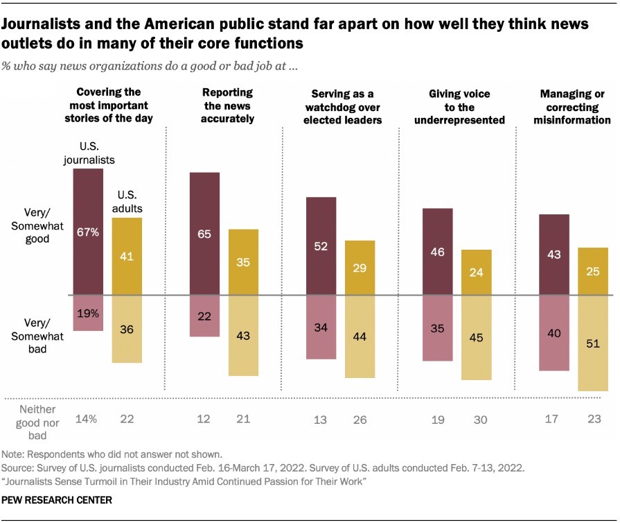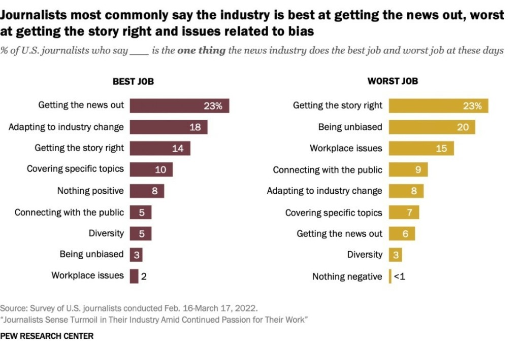 Στην έρευνα του ερευνητικού κέντρου Pew (Πιού), την έγκριτη μη κομματική- μη κερδοσκοπική δεξαμενή σκέψης της Ουάσιγκτον, και στο ερώτημα ποιο είναι το «καλύτερο» και ποιο το «χειρότερο» κατά την άσκηση του δημοσιογραφικού επαγγέλματος σε μια λίστα με εννέα τομείς, οι συμμετέχοντες απάντησαν εξίσου πως το καλύτερο τους είναι να επικοινωνούν τις ειδήσεις και το χειρότερο να λένε την ιστορία σωστά.