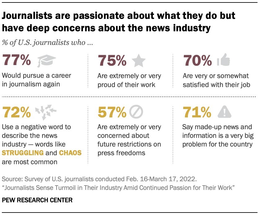 Το μέλλον της ελευθερίας του Τύπου, η ευρεία παραπληροφόρηση, η πολιτική πόλωση και ο αντίκτυπος των μέσων κοινωνικής δικτύωσης είναι πηγές ανησυχίας στον δημοσιογραφικό κόσμο των ΗΠΑ, η συντριπτική πλειοψηφία του οποίου θα επέλεγε ξανά την ίδια καριέρα παρά την πολύμορφη κρίση που αντιμετωπίζει ο κλάδος, σύμφωνα με ευρείας έκτασης έρευνα σε 12.000 δημοσιογράφους.