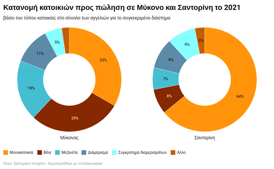 Εστιάζοντας στην τυπολογία των ακινήτων, σημειώνει η σχετική ανακοίνωση, παρατηρείται πως στη Μύκονο αρκετές αγγελίες ανά έτος, από το 2018 έως και το 2021, αφορούσαν πώληση βιλών, με το αντίστοιχο ποσοστό στη Σαντορίνη να παρουσιάζεται χαμηλότερο.