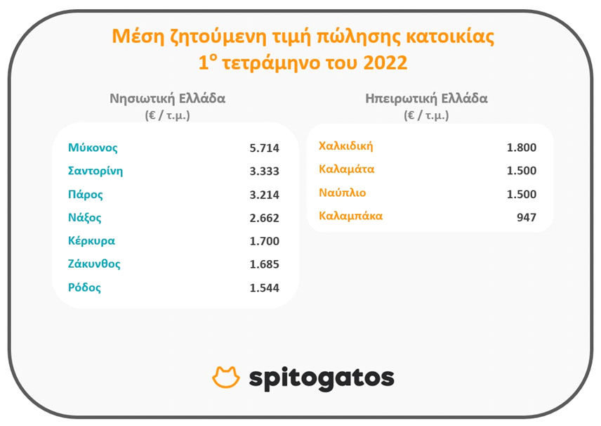 Το πρώτο τετράμηνο του τρέχοντος έτους, η Μύκονος αναδεικνύεται στην τουριστική περιοχή με τις υψηλότερες ζητούμενες τιμές πώλησης κατοικίας στις 5.714 €/τ.μ. Ακολουθεί η Σαντορίνη με μέση ζητούμενη τιμή 3.333 €/τ.μ. αντίστοιχα.