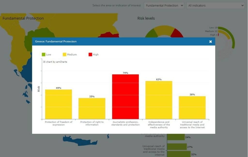 Το κεφάλαιο της έρευνας (στις 27 της Ε.Ε. συν πέντε υποψήφιων χωρών- Αλβανία, Μαυροβούνιο, Β. Μακεδονία, Σερβία, Τουρκία) για την Ελλάδα εντοπίζει ότι, ενώ η ελευθερία της έκφρασης αναγνωρίζεται ρητά στο ελληνικό Σύνταγμα, η Θεμελιώδης Προστασίας της (το θεσμικό προστατευτικό πλαίσιο των ΜΜΕ με άλλο λόγια) από διάφορα ανησυχητικά περιστατικά κατά τη διάρκεια του 2021 δείχνουν ότι δικαίωμα αυτό δεν γίνεται πάντοτε σεβαστό στην πράξη.