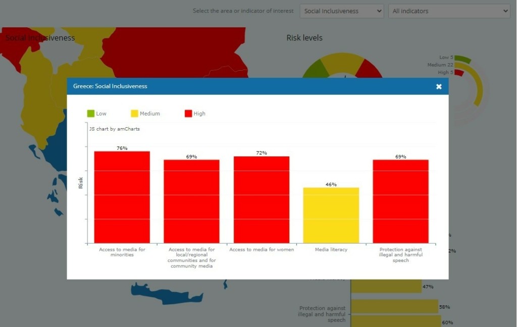 Η πολυφωνία της αγοράς των ΜΜΕ στην Ελλάδα παρουσιάζει μακράν το υψηλότερο επίπεδο κινδύνου (72%). Αυτό συνδέεται κυρίως με την εμπορική και ιδιοκτησιακή επιρροή στο περιεχόμενο των μέσων ενημέρωσης (83%).