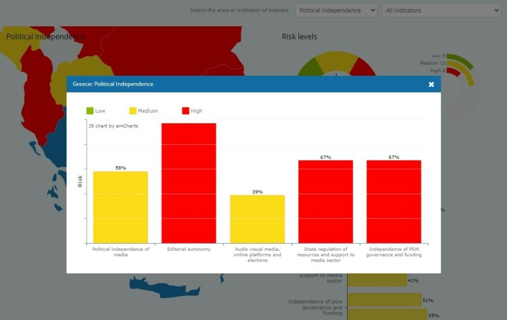 Ο τομέας εξάλλου της «πολιτικής ανεξαρτησίας» για την Ελλάδα είναι στο ανώτατο όριο της κατηγορίας «μέτριο επίπεδο κινδύνου» το οποίο κυμαίνεται μεταξύ 34% και 66%, κάτι που αντανακλά μια πολωμένη εικόνα στο πεδίο των μέσων ενημέρωσης που χαρακτηρίζεται από μια σχέση αλληλεξάρτησης μεταξύ των πολιτικών ελίτ και των ΜΜΕ.