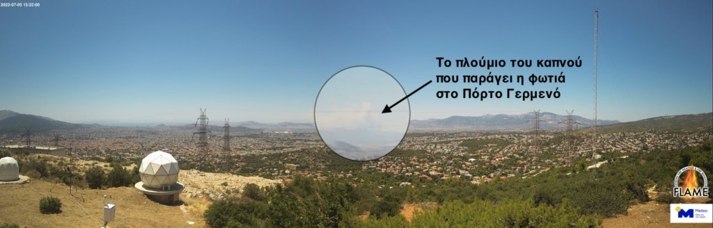 Όπως αναφέρει σε ανακοίνωσή του το meteo, ο καπνός της φωτιάς είναι ορατός και από τις κάμερες του Εθνικού Αστεροσκοπείου Αθηνών (ΕΑΑ)/meteo.gr στην Πεντέλη.
