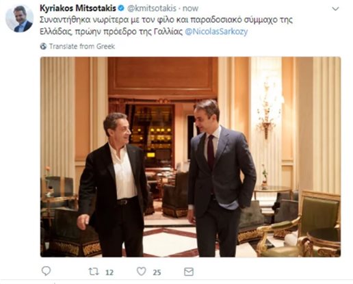 Τότε, ο Κυριάκος Μητσοτάκης ανέβασε μια φωτογραφία με τον πρώην πρόεδρο της Γαλλίας στον προσωπικό του λογαριασμό στο Twitter. Ο πρωθυπουργός συνόδευσε τη φωτογραφία με την εξής λεζάντα: «Συναντήθηκα νωρίτερα με τον φίλο και παραδοσιακό σύμμαχο της Ελλάδας, πρώην πρόεδρο της Γαλλίας @NicolasSarkozy».