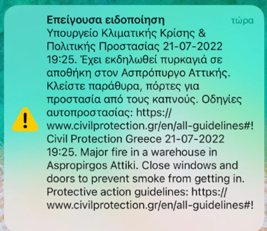 Λίγο πριν τις 19:30 στάλθηκε μήνυμα από το 112 στους κατοίκους της περιοχής για προφύλαξη από τους καπνούς.