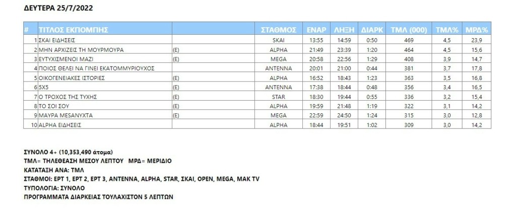 Σε απόσταση αναπνοής, πίσω του, «τερμάτισε» η σε επανάληψη σειρά «Μην αρχίζεις τη μουρμούρα» του Alpha, η οποία είχε μεν το ίδιο ποσοστό τηλεθέασης (4,5%), με το δελτίο του Σκάι, τη διαφορά έκαναν όμως μόλις 5.000 τηλεθεατές.
