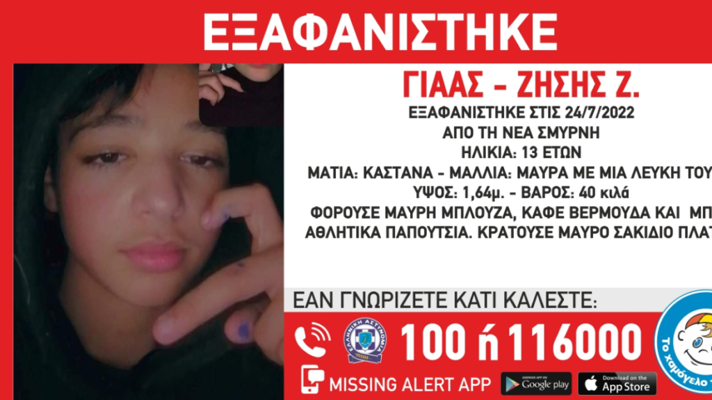 Πρόκειται για τον Ζήση 13 ετών που εξαφανίστηκε από την περιοχή απογευματινές ώρες στις 24/07/2022.