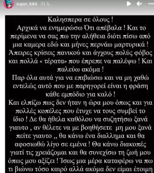 Με ένα story της στον προσωπικό της λογαριασμό στο Instagram, η Super Κική ενημέρωσε τους διαδικτυακούς της φίλους πως απέβαλε.