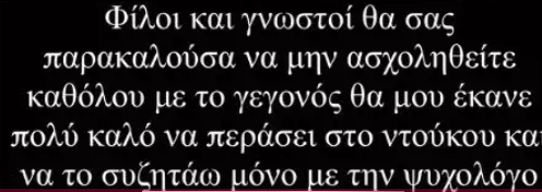 Και ελπίζω πως δεν ήταν η ώρα μου όπως και για πολλές κοπέλες που τους έχει συμβεί το ίδιο. Δε θα ήθελα καθόλου να συζητήσω ξανά γι’ αυτό, αν θέλετε να με βοηθήσετε μη μου ξαναπείτε γι’ αυτό, θα κάνω ένα διάλλειμα και θα αφοσιωθώ για λίγο σε μένα. Θα κάνω διακοπές γιατί τις χρειάζομαι και θα συνεχίσω τη ζωή μου όπως μου αξίζει. Ίσως μια μέρα καταφέρω να πω τι βιώνω τόσο καιρό αλλά δεν είμαι ακόμα έτοιμη. Φίλοι και γνωστοί θα σας παρακαλούσα να μην ασχοληθείτε καθόλου με το γεγονός. Θα μου έκανε πολύ καλό να περάσει στο ντούκου και να το συζητάω μόνο με την ψυχολόγο μου» ανέφερε μεταξύ άλλων.