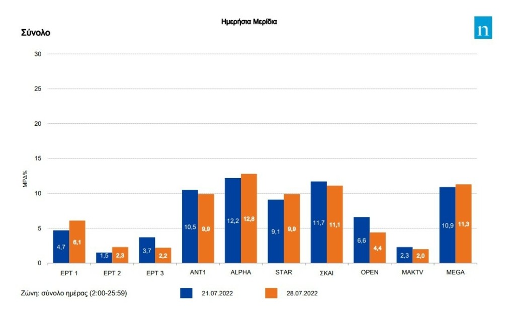 Στη ημερήσια μάχη τηλεθέασης των καναλιών ο Alpha διατήρησε την πρωτοκαθεδρία με το Mega δεύτερο και τρίτο τον Σκάι. Η «κόντρα» μεταξύ ΑΝΤ1 και Star συνεχίζεται και χθες έκλεισε με ισοπαλία, όπως και την Τετάρτη.
