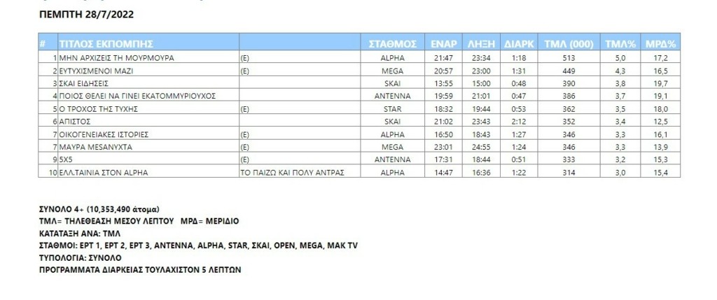 Ετσι λοιπόν πρώτη σε προτιμήσεις, μεταξύ όσων δεν έχουν φύγει διακοπές και επιμένουν τηλεοπτικά, ήταν η σειρά «Μην αρχίζει τη μουρμούρα». Από κοντά η σειρά «Ευτυχισμένοι μαζί» και στο τρίτο σκαλοπάτι διατηρήθηκε το μεσημεριανό δελτίο του Σκάι.