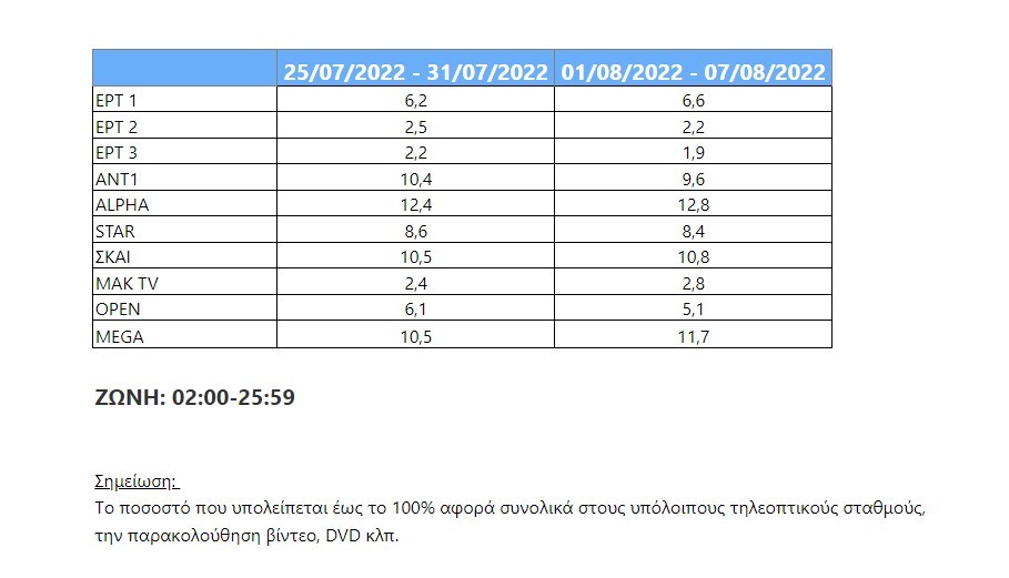 Το πρώτο επταήμερο του Αυγούστου «έκλεισε» με τον Alpha να διατηρεί το μεγαλύτερο σε διαστάσεις μερίδιο τηλεθέασης του ανταγωνισμού.
