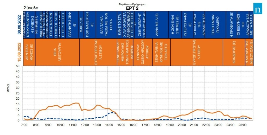 Επίσης, η ΕΡΤ2 είδε το μερίδιο της εντός του ίδιο διαστήματος από το 1,2% (την Παρασκευή 12/8) να κλιμακώνεται φθάνοντας στο 4,1 (14/8) και εν τέλει στο 6% (15/8) χάρη στις μεταδόσεις των Θείων Λειτουργιών το πρωί και το βράδυ αλλά και την ζωντανή κάλυψη της ενόργανης γυμναστικής στο πλαίσιο του ευρωπαϊκού πρωταθλήματος στίβου που διεξάγεται στο Μόναχο.