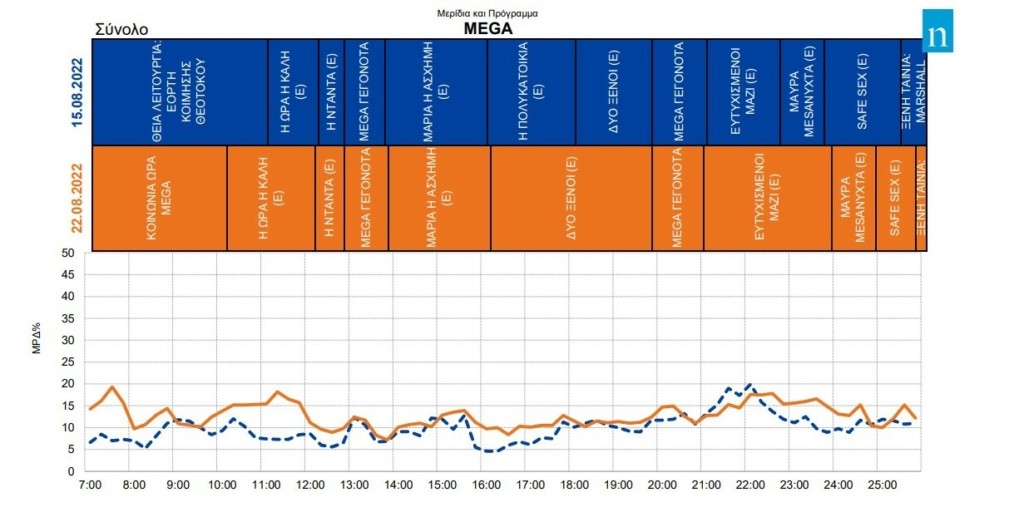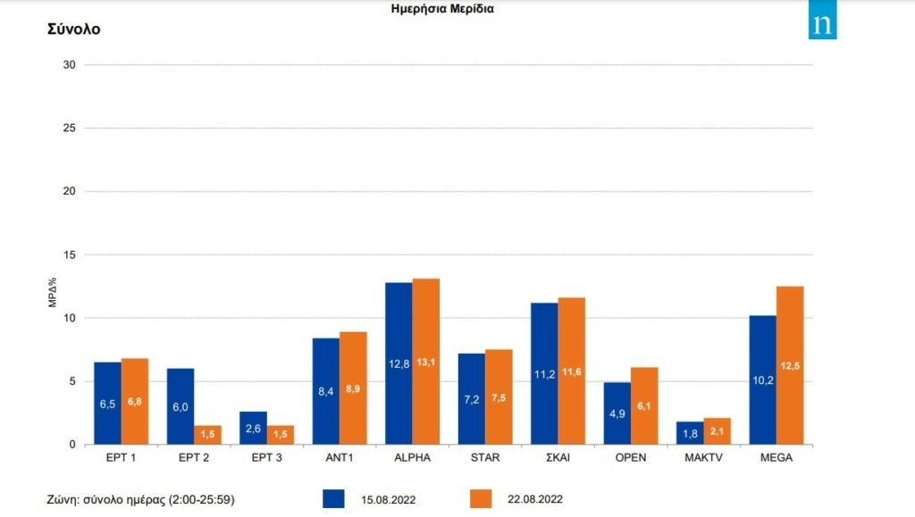 Πήραν τα «πάνω» τους τα μερίδια των ιδιωτικών καναλιών την Δευτέρα (22/8) και Alpha και Mega «κονταροχτυπήθηκαν» για το μεγαλύτερο κομμάτι από την πίτα τηλεθέασης της ημέρας, σύμφωνα με τα στατιστικά της Nielsen.