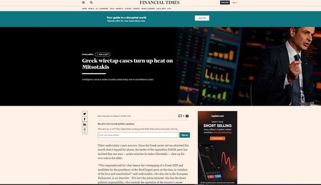 Οι Financial Times ασχολούνται με την υπόθεση των υποκλοπών. Δημοσίευμα της εφημερίδας έχει τίτλο «Οι ελληνικές υποθέσεις υποκλοπών προκαλούν καύσωνα στον Μητσοτάκη».