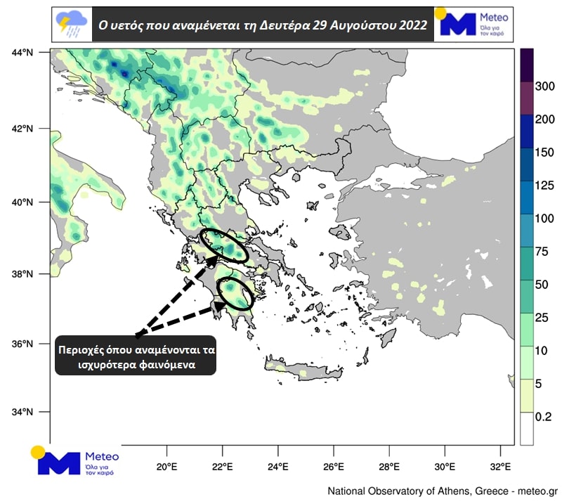 Στον χάρτη που ακολουθεί παρουσιάζεται ο υετός που αναμένεται τη Δευτέρα (29/8), ενώ σημειώνονται και οι περιοχές όπου αναμένονται τα ισχυρότερα φαινόμενα.