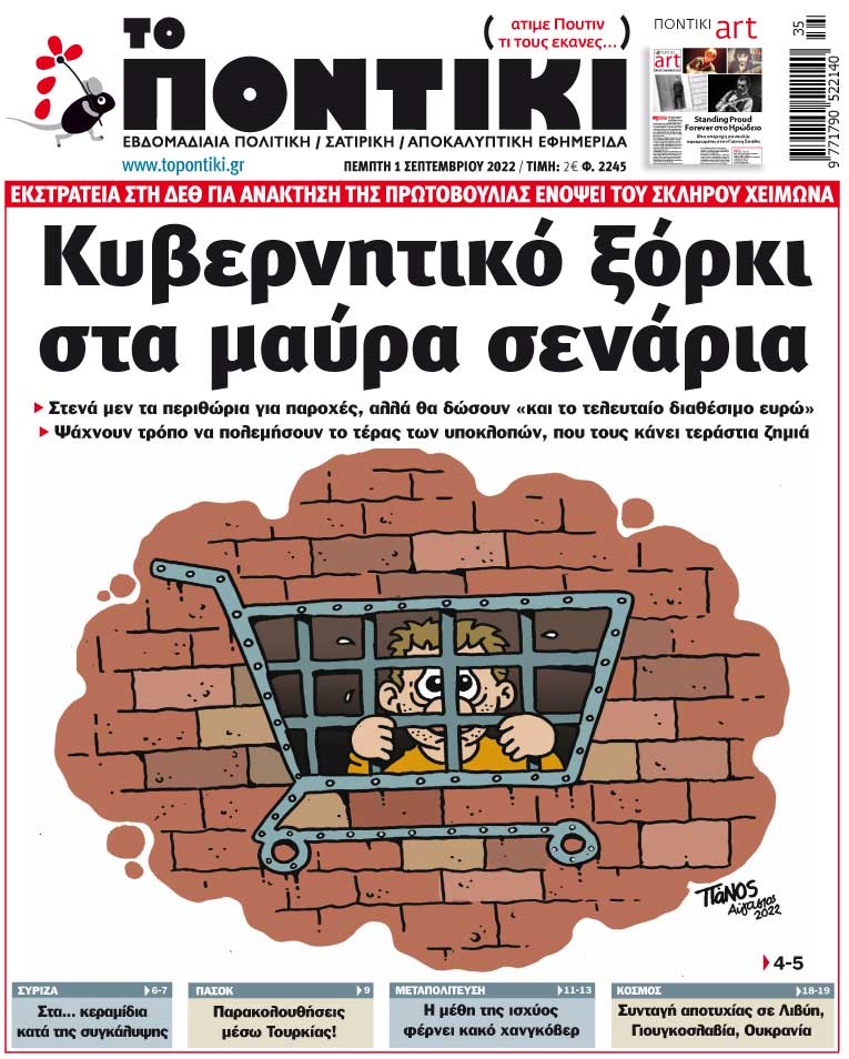Με πρωτοσέλιδο τίτλο «Κυβερνητικό ξόρκι στα μαύρα σενάρια» και αναλυτικό – αποκαλυπτικό ρεπορτάζ για την εκστρατεία στη ΔΕΘ για ανάκτηση της πρωτοβουλίας ενόψει του σκληρού χειμώνα, αλλά και τον τρόπο που ψάχνουν στην κυβέρνηση να πολεμήσουν το τέρας των υποκλοπών που τους κάνει τεράστια ζημιά, κυκλοφορεί το «ΠΟΝΤΙΚΙ» το πρωί της Πέμπτης.