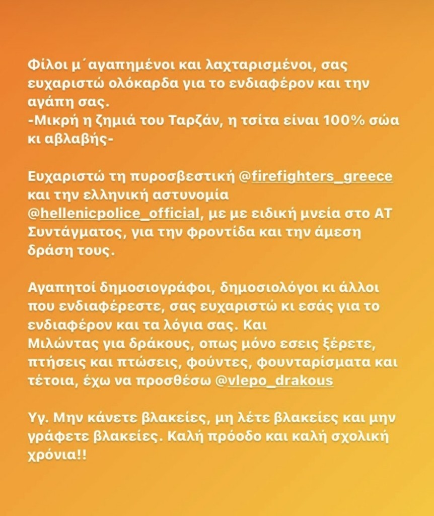 «Φίλοι μου αγαπημένη και λαχταρισμένοι σας ευχαριστώ ολόκαρδα για το ενδιαφέρον και την αγάπη σας. -Μικρή η ζημιά του Ταρζάν, η τσίτα είναι 100% σώα και αβλαβής-