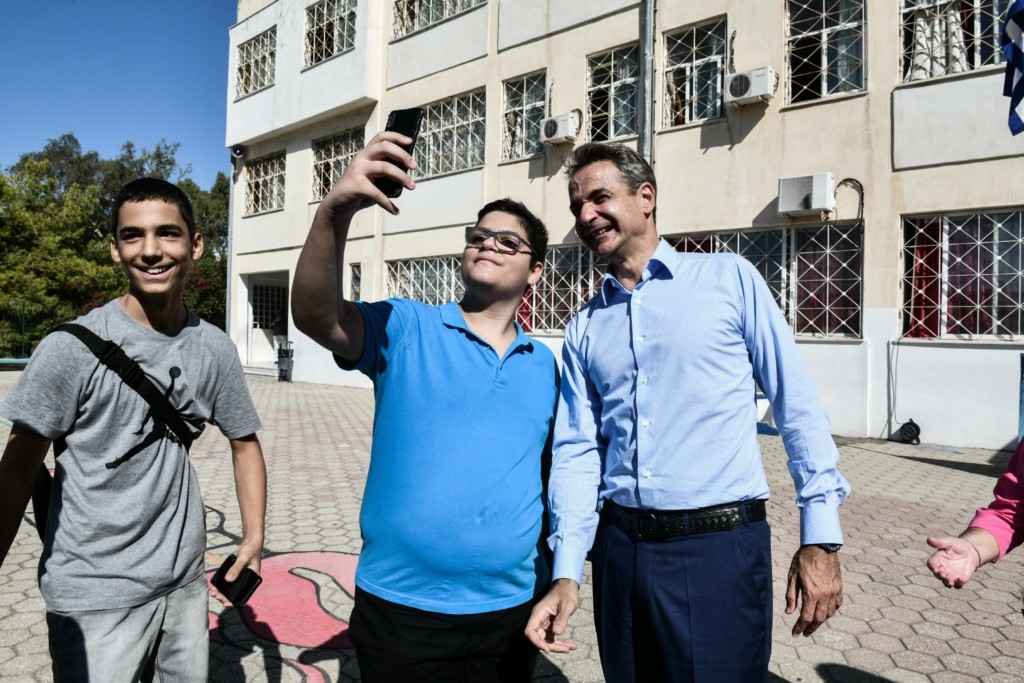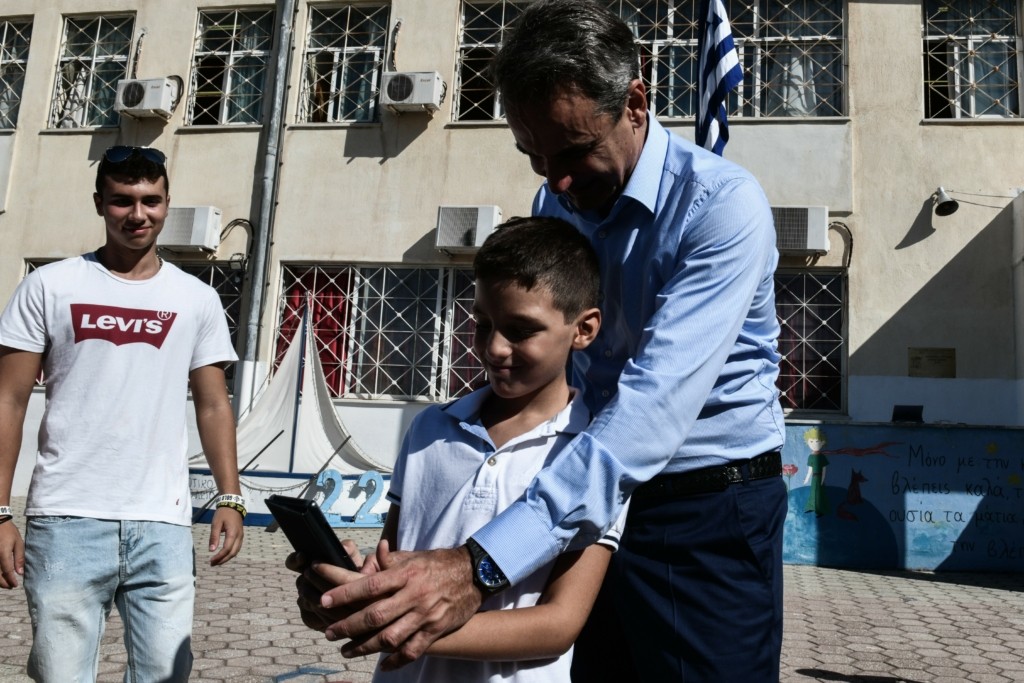 Ο πρωθυπουργός συνομίλησε με τα παιδιά και ευχήθηκε καλή σχολική χρονιά σε όλους, ενώ δεν έλειψαν και οι selfies με τους μικρούς μαθητές.