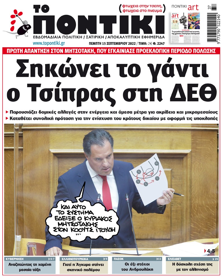 Με πρωτοσέλιδο τίτλο «Σηκώνει το γάντι ο Τσίπρας στη ΔΕΘ» και αναλυτικό – αποκαλυπτικό ρεπορτάζ για τις δομικές αλλαγές στην ενέργεια και τα άμεσα μέτρα για ακρίβεια και μικρομεσαίους που παρουσιάζει ο Αλέξης Τσίπρας, αλλά και τη συνολική πρόταση που καταθέτει για την ενίσχυση του κράτους δικαίου με αφορμή τις υποκλοπές, κυκλοφορεί το «ΠΟΝΤΙΚΙ» το πρωί της Πέμπτης.