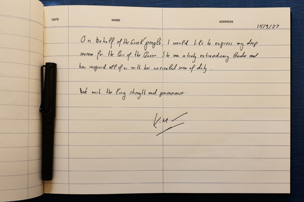 Στο βιβλίο συλλυπητηρίων της Βρετανικής Πρεσβείας για τη Βασίλισσα Ελισάβετ υπέγραψε χθες ο Κυριάκος Μητσοτάκης.
