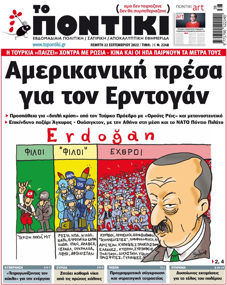 Με πρωτοσέλιδο τίτλο «Αμερικανική πρέσα για τον Ερντογάν» και αναλυτικό – αποκαλυπτικό ρεπορτάζ για την προσπάθεια του Τούρκου προέδρου για «διπλή κρίση» με «Ορούτς Ρέις» και μεταναστευτικό, αλλά και το επικίνδυνο παζάρι Άγκυρας – Ουάσινγκτον, με την Αθήνα στη μέση και το ΝΑΤΟ Πόντιο Πιλάτο, κυκλοφορεί το «ΠΟΝΤΙΚΙ» το πρωί της Πέμπτης.