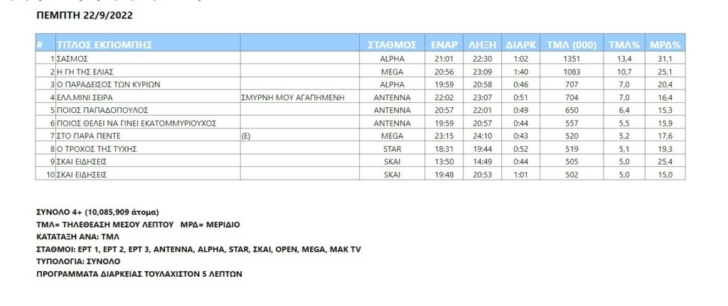 Εντωμεταξύ κοντά σε αυτά συνυπολογίστε και το πρώτο επεισόδιο της σειράς «Σμύρνη μου αγαπημένη» κύκλου τεσσάρων επεισοδίων που κατηύθυνε στον ΑΝΤ1 704.000 τηλεθεατές μεταξύ 22.00 και 23.00.