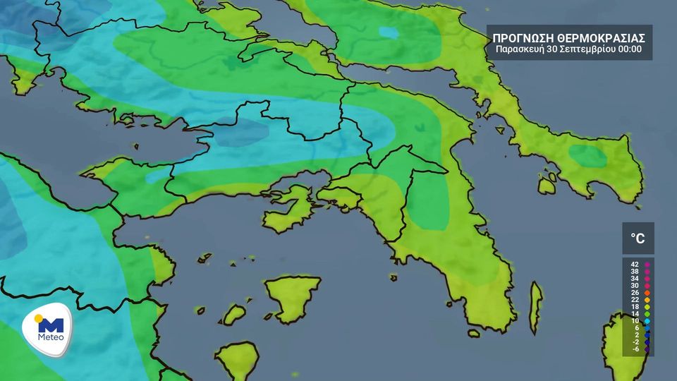 Η θερμοκρασία θα κυμανθεί στη Δυτική Μακεδονία από 7 έως 25 βαθμούς, στην υπόλοιπη Βόρεια Ελλάδα από 7 έως 29-30 βαθμούς, στην Ήπειρο από 9 έως 24-25 βαθμούς, στη Θεσσαλία από 8 έως 29, στα υπόλοιπα ηπειρωτικά από 9 έως 28-29 βαθμούς, στα νησιά του Ιονίου από 17 έως 23-25 και στα νησιά του Αιγαίου και την Κρήτη από 17 έως 28-30 βαθμούς Κελσίου.