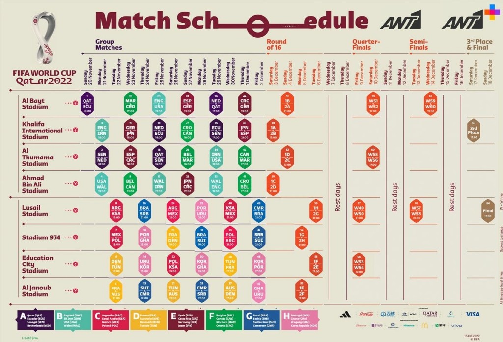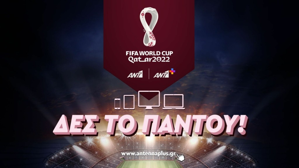 Το σύνολο των αγώνων, από το εναρκτήριο παιχνίδι, στις 20 Νοεμβρίου, έως τον μεγάλο τελικό στις 18 Δεκεμβρίου θα προβληθεί από το ειδικό θεματικό κανάλι FIFA World CupTM του ΑΝΤ1+, 32αγώνες θα μεταδοθούν από τη συχνότητα του ΑΝΤ1, ενώ και οι 64 αγώνες θα μεταδοθούν από τη streaming πλατφόρμα ΑΝΤ1+.