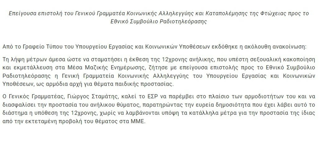 Η κυβερνητική παρέμβαση στην υπόθεση με τους επικίνδυνους χειρισμούς ηλεκτρονικών ΜΜΕ στο θέμα του 12χρονου κοριτσιού υπογραμμίζει την σοβαρότητα της κατάστασης. Δείχνει ότι είναι ανεξέλεγκτη.