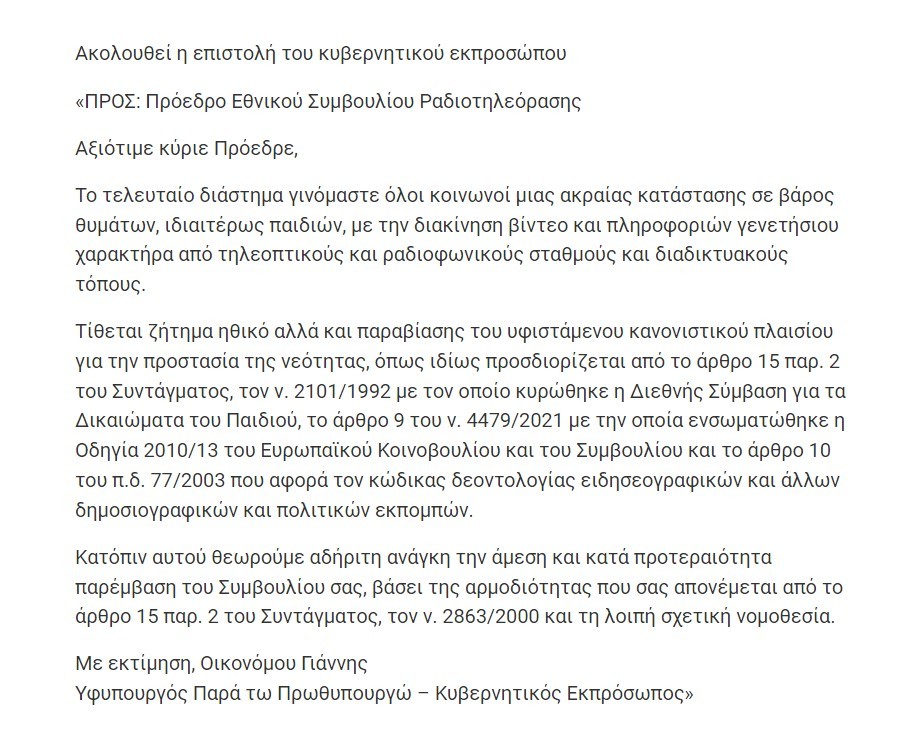 Ο κυβερνητικός εκπρόσωπος με επιστολή του στο ΕΣΡ ζητά από την Ανεξάρτητη Αρχή να επιτελέσει το ρόλο της.